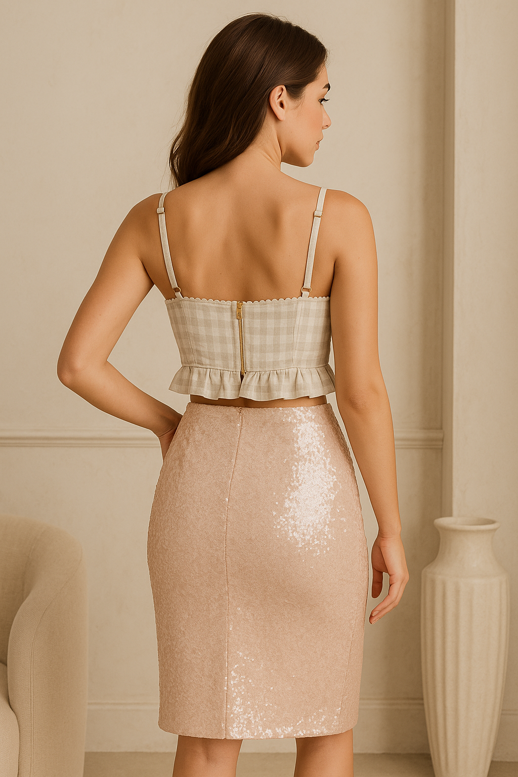 No te pierdas la oportunidad de añadir esta prenda imprescindible a tu armario. Con el top corto de cuadros beige, tendrás una combinación perfecta de moda, funcionalidad y elegancia para cualquier momento del día.