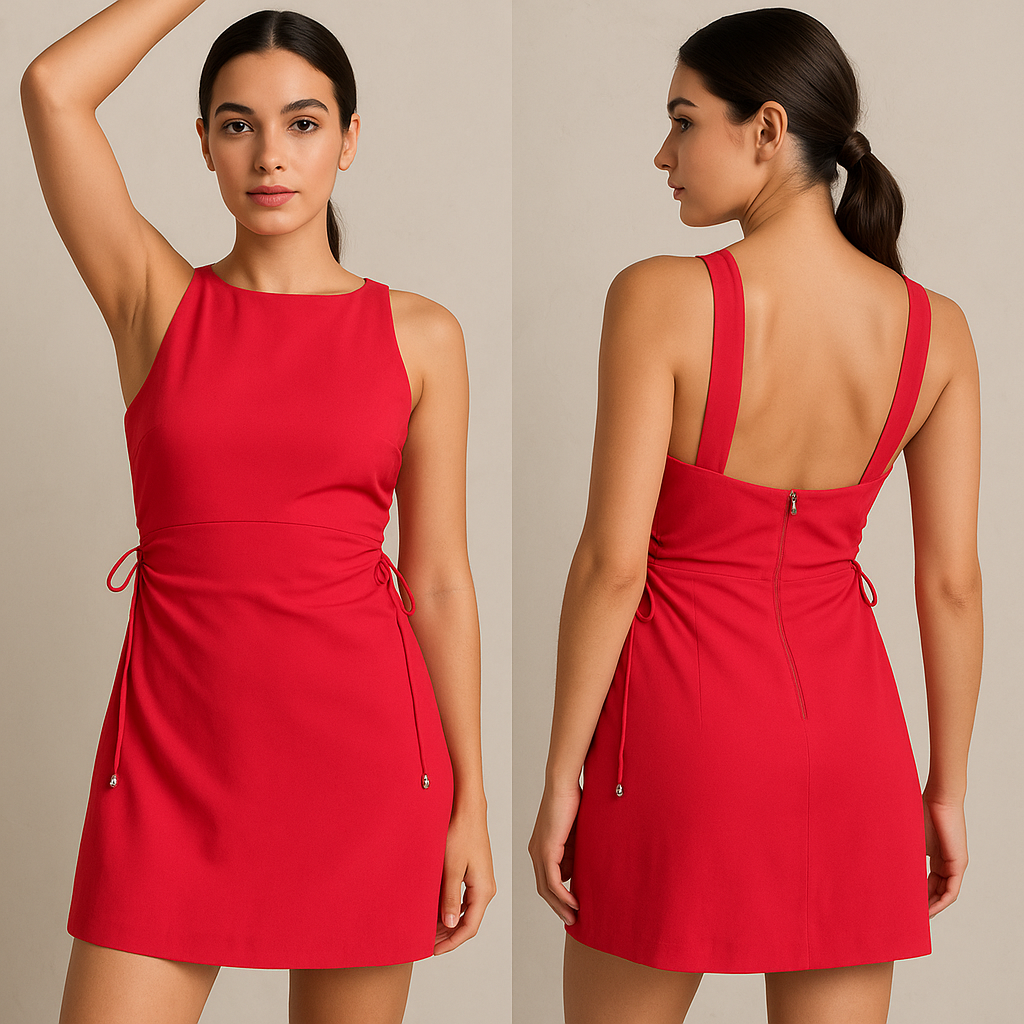 Diseño versátil que realza tu figura: Este vestido cuenta con un corte corto que estiliza tus piernas mientras los lazos laterales en la cintura aportan un toque de sofisticación, ajustándose perfectamente para realzar tu figura. El cuello redondo añade un aire clásico y equilibrado, asegurando que el diseño sea elegante y atemporal. Su tonalidad vibrante en rojo aporta pasión y carácter, haciéndolo una elección segura para quienes buscan atraer miradas.